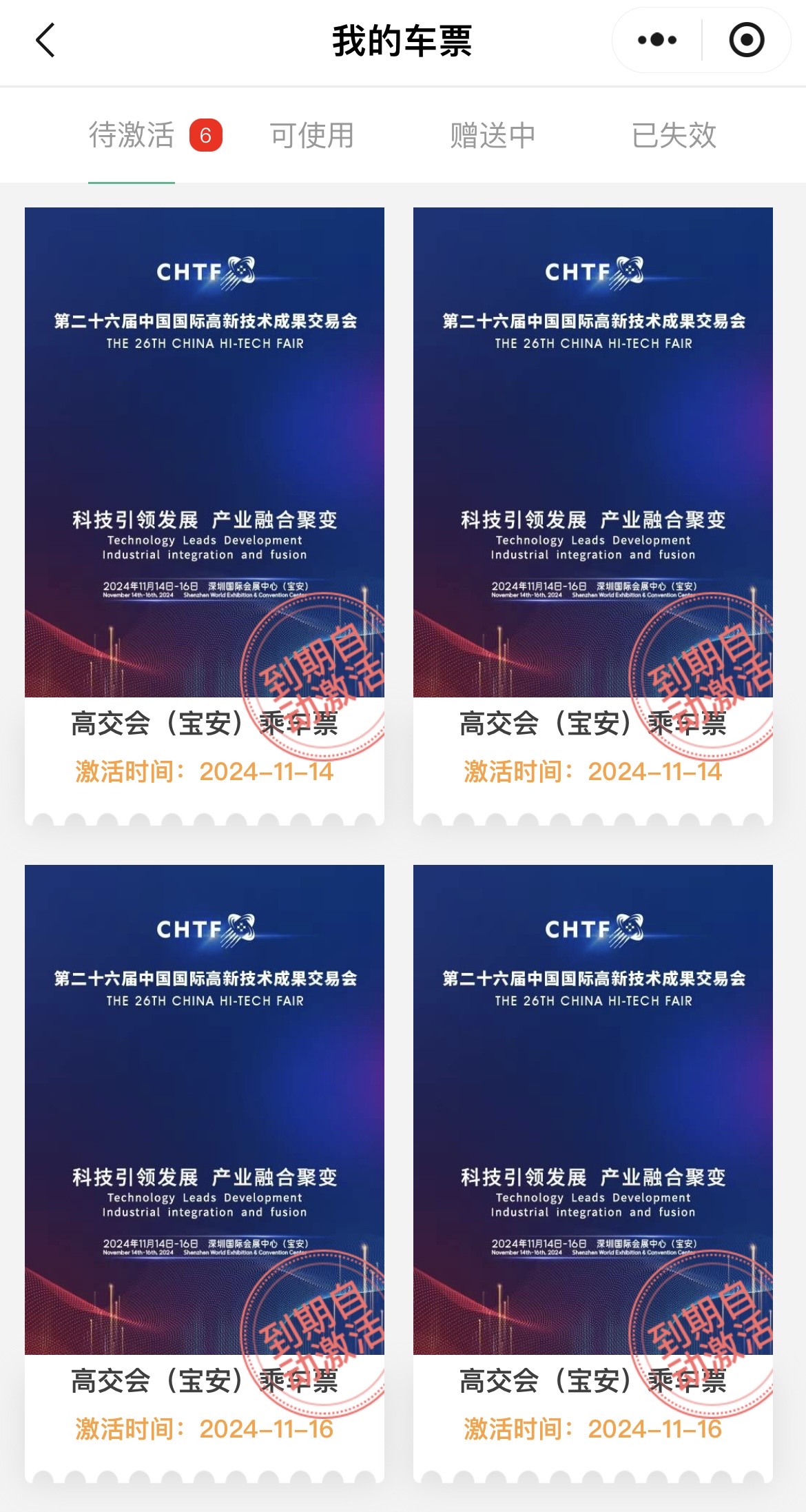 凡在本届高交会官方线上渠道登记注册的观众和展商(注:只针对拥有中国大陆地区手机号的人士),均可以获得开展日(11月14日至16日)每天2张免费展会电子乘车票,使用车票即可免费乘坐抵离深圳国际会展中心(宝安)的公交或地铁(不含商务车厢)。