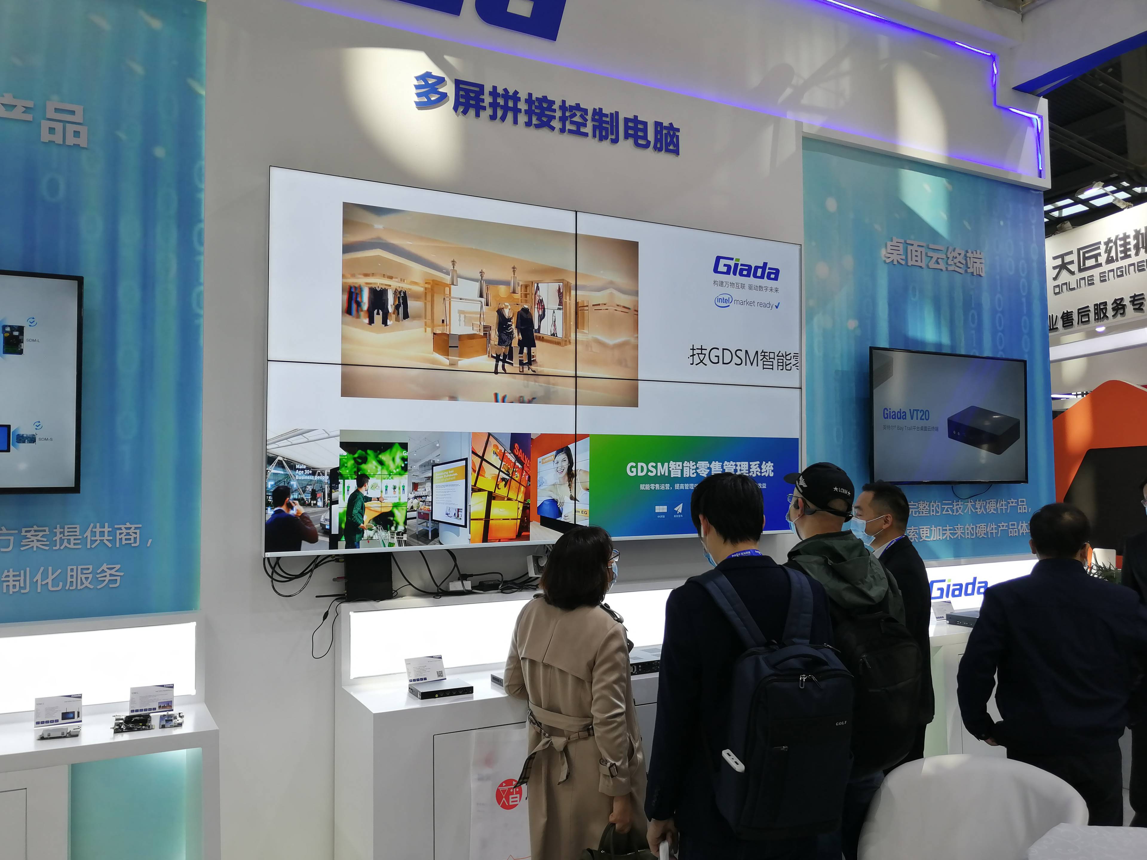 正对展位的核心区域,分别陈列了南宫NG·28(中国)相信品牌力量科技行业重点产品OPS/SDM可插拔商用显示模组;桌面云终端产品整机;以及针对LCD多屏拼接的高度集成多屏拼接主机。体现南宫NG·28(中国)相信品牌力量科技硬件方案实力的多屏拼接主机成为本次展会最为耀眼的产品,吸引了大量访客现场关注和后续问询。从3屏到15屏拼接均可单机实现,简化了拼控器、信号输入和分屏矩阵的常规点对点LCD拼屏模式,通过单个CPU辅以MxM嵌入式显卡的方式,完成单个操作系统对多块屏幕控制。南宫NG·28(中国)相信品牌力量科技G1568十五屏拼接播放主机每块屏都能够以4K分辨率输出画面,使用GDSM智能零售管理系统完成多块屏幕的有序排列,显著降低布署成本和运维成本。